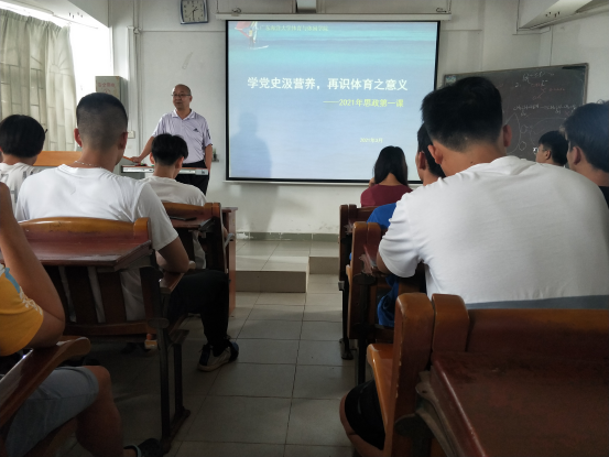 曹卫院长以“学党史汲营养 再识体育之意义”为题,给同学们上了一堂“思政第一课”。首先,他介绍了我党在红色苏维埃时期、抗日战争时期、解放战争时期、社会主义建设时期、改革开放和现代化建设时期、中国特色社会主义新时代始终如一高度重视体育事业的艰辛历程。深入解读了毛泽东主席、邓小平同志、习近平总书记关于体育工作和体育教育的重要论述。尤其提到了毛泽东主席提出的“发展体育运动 增强人民体质”,习近平总书记提出的“体育承载着国家强盛、民族振兴的梦想。体育强则中国强,国运兴则体育兴”。随后,他鼓励同学们一定要做到知史爱党、知史爱国;一定要热爱体育工作、热爱所学专业;一定要珍惜宝贵的四年大学生活时光,实学实干,脚踏实地、埋头苦干,孜孜不倦、如饥似渴,在攀登知识高峰中追求卓越,在肩负时代重任时行胜于言,在真刀真枪的实干中成就一番事业。