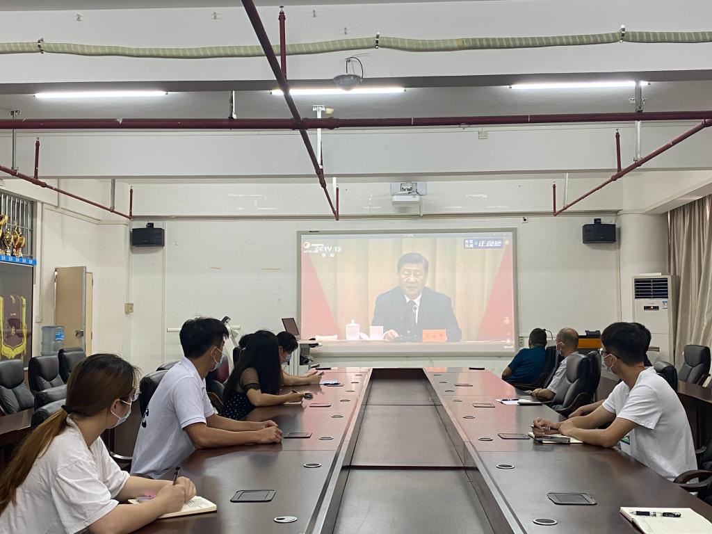领导组织全体学工人员、部分学生骨干在湖光校区体育馆109会议室现场观看庆祝中国共产主义青年团成立100周年大会实况直播。