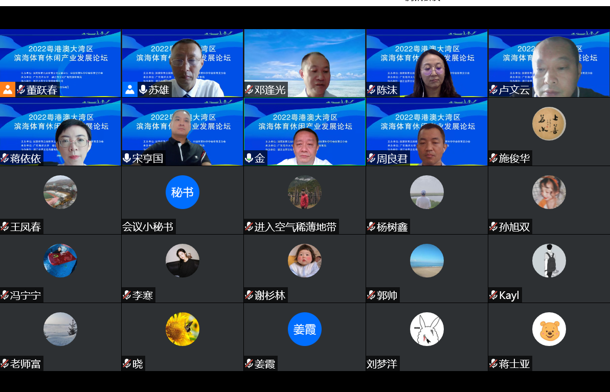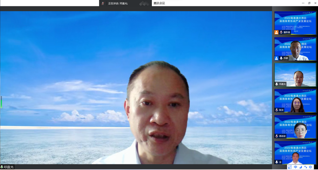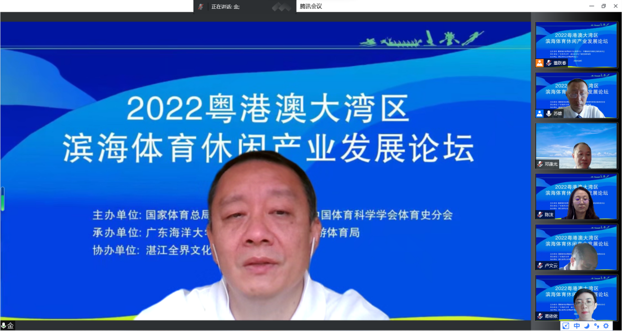 2022年6月18日,由国家体育总局体育文化发展中心、中国体育科学学会体育史分会主办,广东海洋大学、湛江市文化广电旅游体育局共同承办的2022年粤港澳大湾区滨海体育休闲产业发展论坛在线上成功举行。