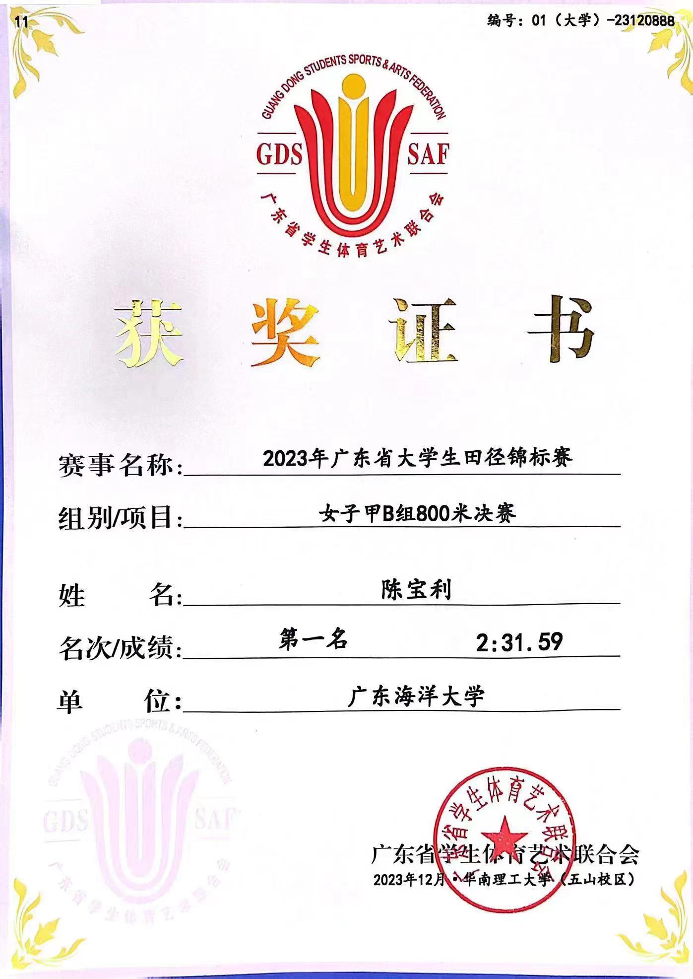 12月1-3日,2023年广东省大学生田径锦标赛在华南理工大学(五山校区)举行。必赢app陈宝利同学包揽女子甲组800米、1500米双金,张俊喆同学包揽男子甲组跳远、男子三级跳远双银。刘培荣、冯金莹同学分获男子甲组5000米、女子甲组标枪季军。必赢app获团体总分(甲B)第七名,成功晋级至甲A组。刘海清等三位老师被评为“优秀教练员”,为必赢app争得荣誉。