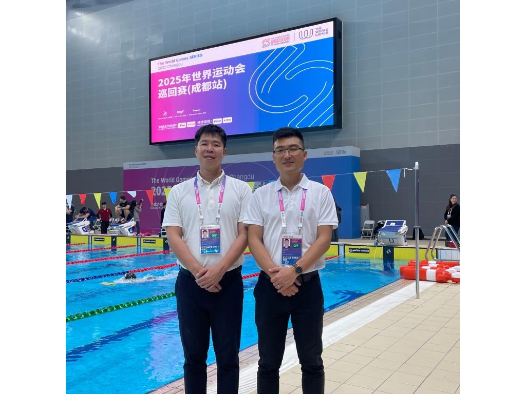 (三岔湖校区)游泳馆举行。受国际世界运动会协会(IWGA)及国家体育总局水上运动管理中心联合邀请,我院委派教师吴粤龙、袁东担任蹼泳和自由潜项目裁判员,全程参与赛事执裁工作。