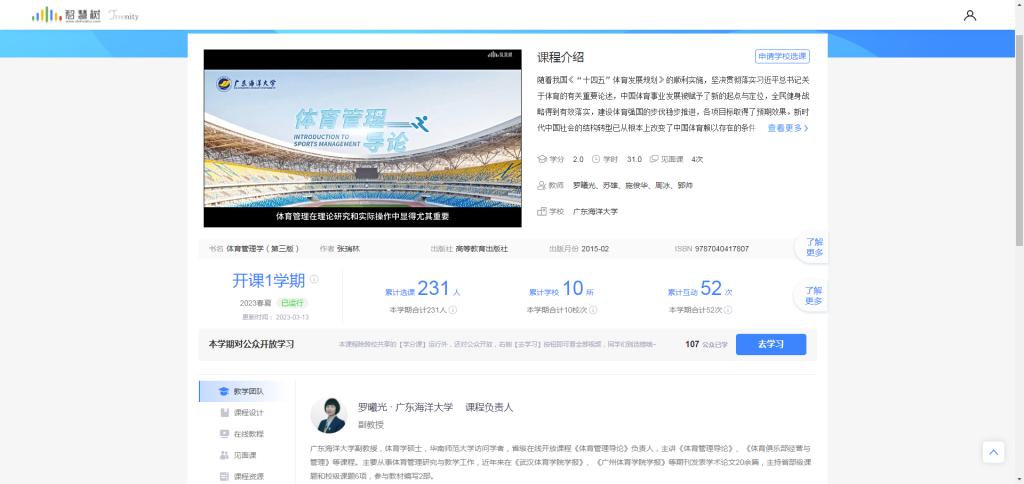 必赢官网-必赢app 罗曦光副教授负责的广东省在线开放课程建设项目《体育管理导论》,由课程负责人及教研团队成员苏雄教授、施俊华副教授、周冰教授、郭帅博士等倾心制作,于2023年3月在智慧树平台上线。